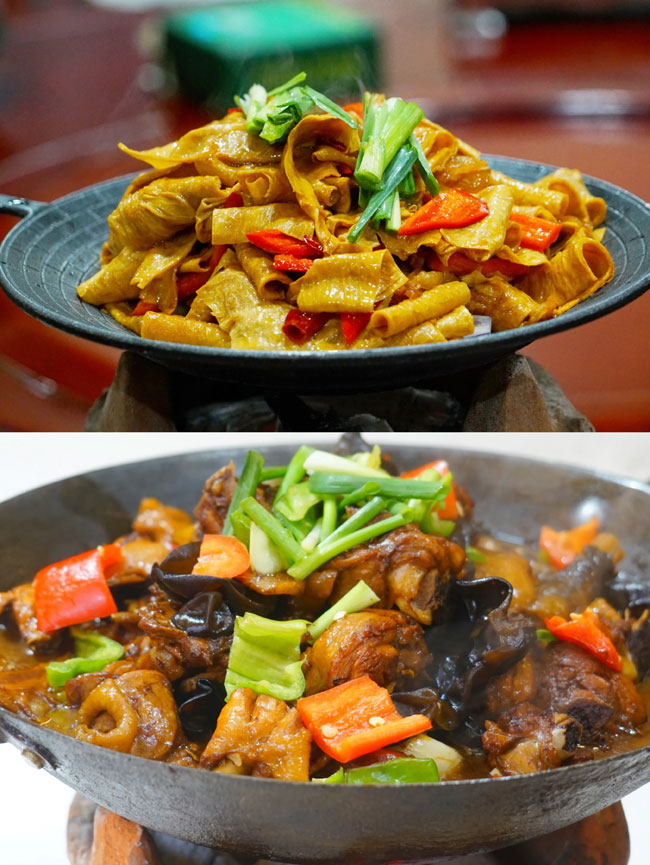 吊锅土鸡:这是大别山地区的一道传统美食,土鸡是村里家养的,满满的一锅鲜鸡汤煨着,吃起来热气腾腾的。