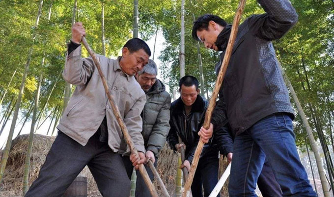 每年过了腊八,村里家家户户就开始打糍粑了。村里有一口古老的石槽,它是打糍粑的必需品。打糍粑是力气活,家里人要先将糯米用盆淘干净备用,在大锅里加入比较多的水加热煮沸,加入备用的糯米煮一下;然后把煮好的糯米与米汤分开,糯米用木质的饭甑蒸熟。蒸熟后,把蒸熟的糯米倒石槽中,村里的年轻力壮的人用木锤不停的捶打,翻滚着捶打,直到糯米全部粘成一团。